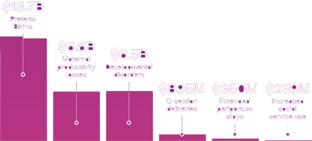 A data visualization showing the breakdown of the $32.3 billion societal cost of maternal morbidity: